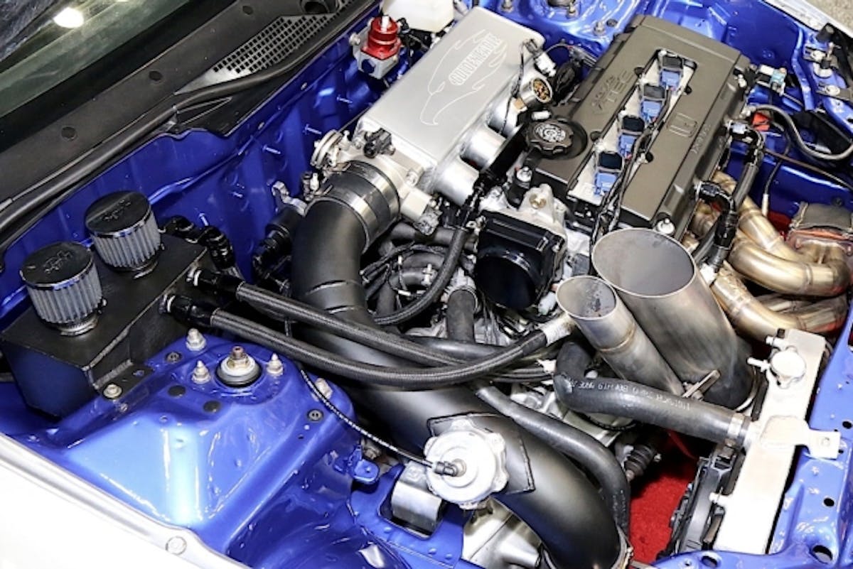 Other features include TiAl blow-off valve and wastegate, Skunk2 90 mm throttle body and SouthBay 2,200 cc fuel injectors. Controlling the fuel and spark is a Hondata S300v3.