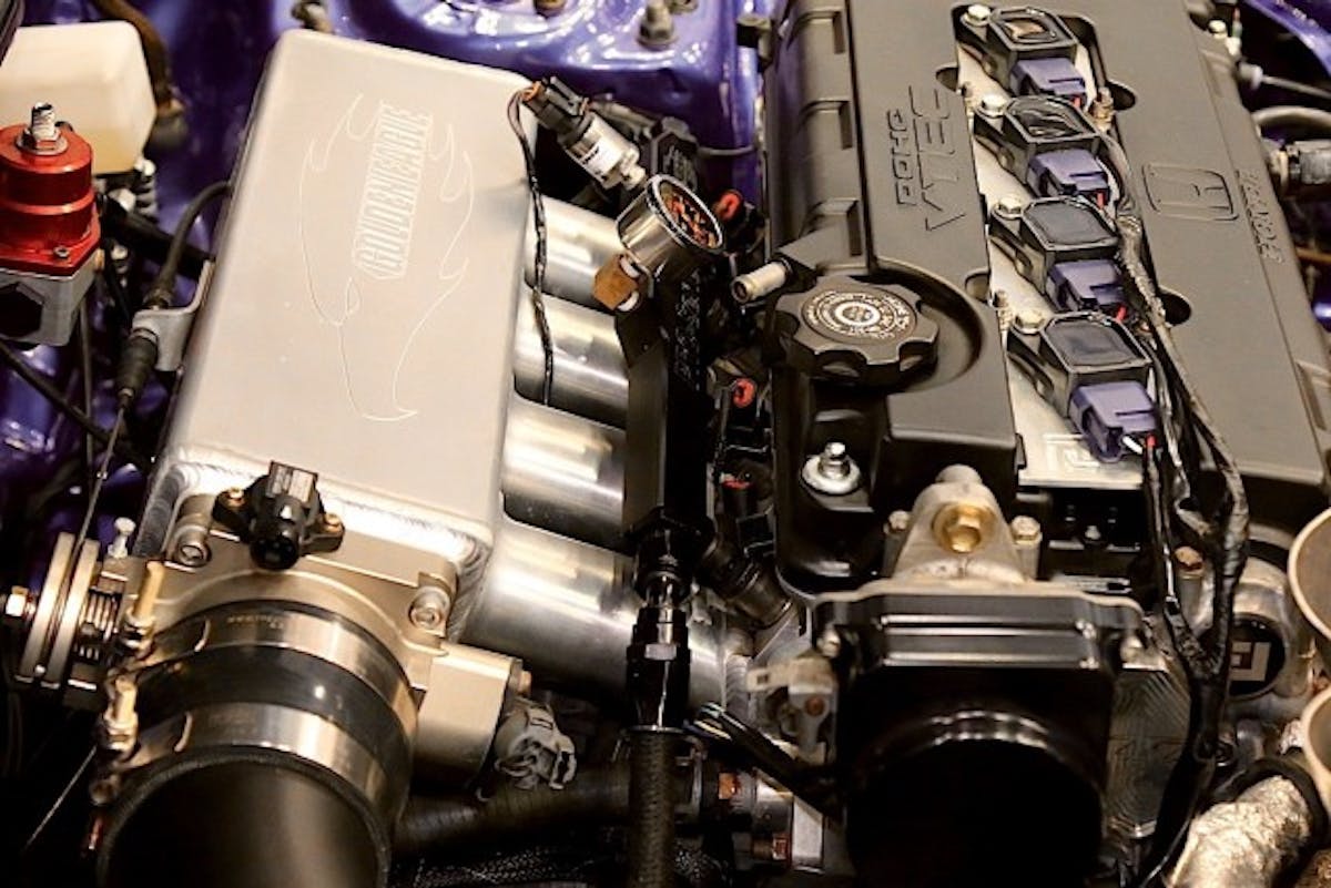 The engine boasts unported stock Honda cylinder heads that were upgraded with stainless steel intake valves, Inconel exhaust valves, stiffer springs and titanium retainers from Supertech. The Pro series cams are from Skunk2 Racing.