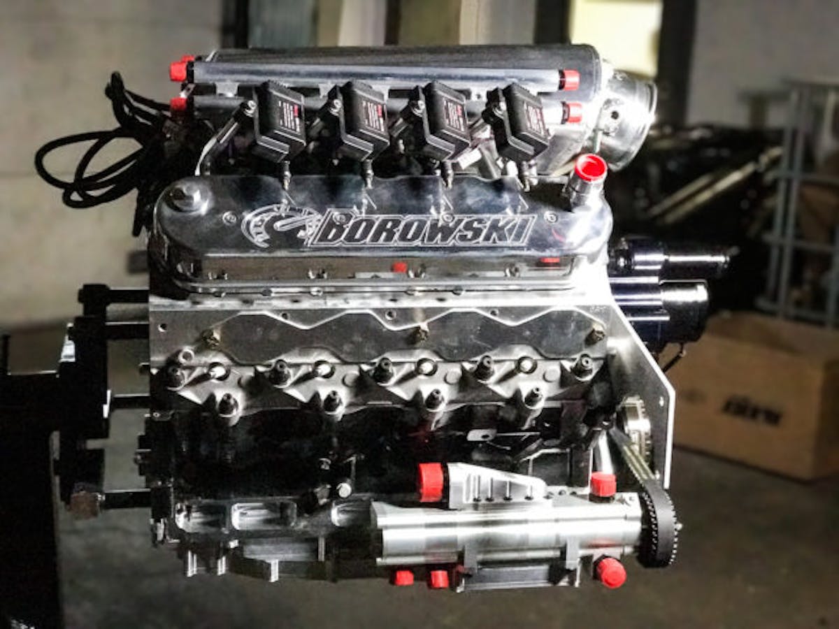 Inside the block sits one of Callies‘ billet Ultra Light crankshafts and a set of the company’s forged Ultra I-beam connecting rods–of undisclosed dimensions–to support the hard-anodized Diamond pistons, which have been constructed to Borowski’s specifications.