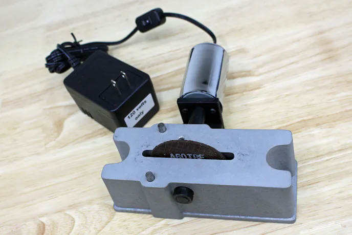 The Proform electric filer has a body made from aluminum, with provisions to be mounted directly to a workbench via integral mounting holes. The surface of the filer has been machined flat, and two dowels are installed to help true up the ring as it’s being filed. This model comes standard with a 120-volt adapter, but a 220-volt model is available for international applications.