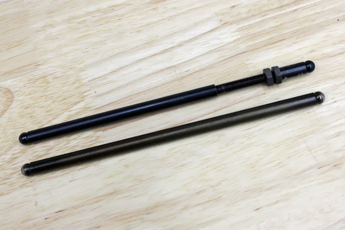 One thing that can bring a project to a screeching halt is realizing your guess at pushrod length was wrong. Proform makes a variety of sizes of adjustable pushrod, from 6.125 inches all the way up to 11.500 inches. What you see here is P/N: 67560, which adjusts from 6.125 inches to 7.500 inches, which will cover both our LS project as well as the SBF we have in storage.
