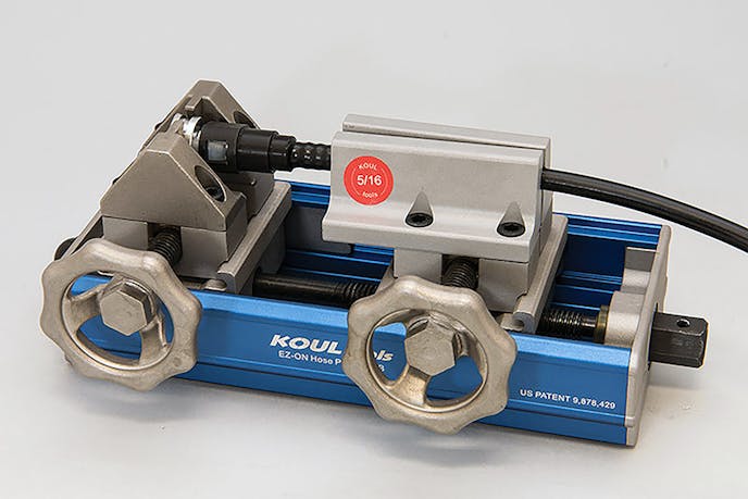 “Mechanics and car enthusiasts have been asking for a solution to assemble nylon fuel lines and we’ve responded,” said Dick Raczuk, founder of Koul Tools. What Raczuk came up with is a heavy-duty assembly kit with specially designed clamps to secure both the line and the fitting, which is then mated to the EZ-ON press and the fitting and line are joined through a screw drive.