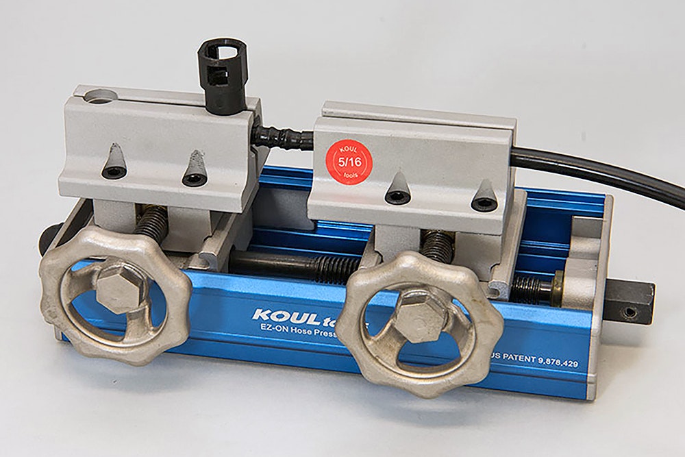 “Mechanics and car enthusiasts have been asking for a solution to assemble nylon fuel lines and we’ve responded,” said Dick Raczuk, founder of Koul Tools. What Raczuk came up with is a heavy-duty assembly kit with specially designed clamps to secure both the line and the fitting, which is then mated to the EZ-ON press and the fitting and line are joined through a screw drive.