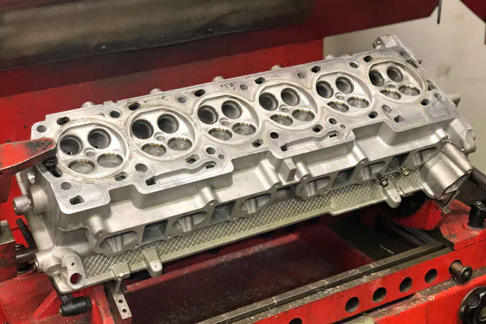 Starting with an OEM Barra cylinder head, Bowling performed some pocket porting by hand. Then Bowling fitted a set of Supertech EV8 stainless-steel intake valves, coated with Black Nitride. “Nitrided valves offer a higher surface hardness while maintaining ductility of the stainless steel, so they are not brittle,” says Bowling. “They also offer a smoother surface finish resulting in less friction in the guide.”