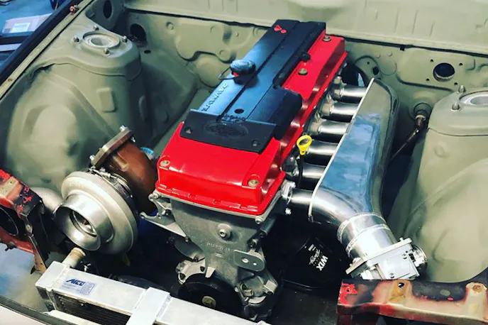 The other star of this engine combination is the BorgWarner S400 80mm SX-E turbocharger. Pushed hard, it will make an expected 40psi of boost. In order to funnel all of that boost into the Barra’s intake ports, Bowling opted for a Hypertune intake manifold kit from Australia, fitted with a 90mm K-Tuned throttle body.