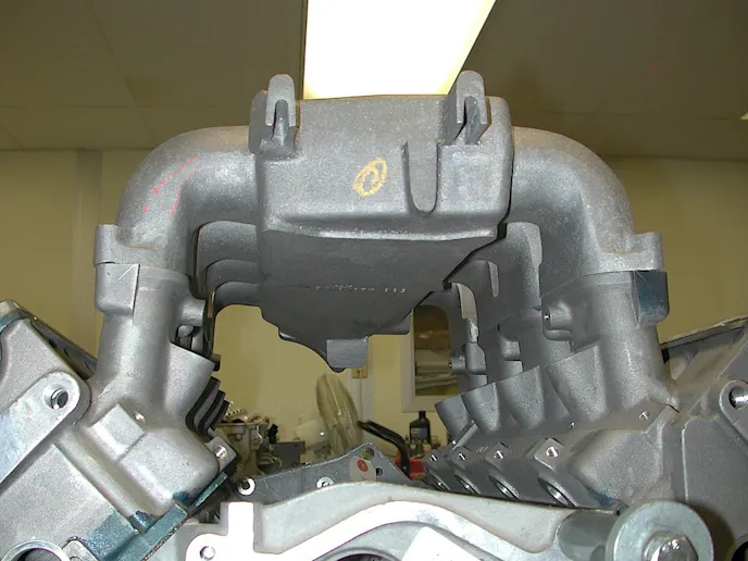 Topping off the engine was not an easy proposition, either – the prototype intake that matched the heads was located. There was only one plenum made back then, and this is it. The intake required final machining as it was just the raw casting without bolt holes or any other finishing touches.