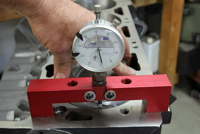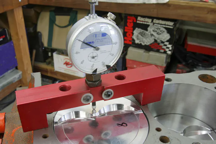 Measuring deck height was the easiest part of this process. We used an inexpensive deck bridge and a dial indicator. Place the bridge on the block and zero the gauge, then set the dial indicator up as close to the wrist-pin centerline as possible. This minimizes piston rock across top dead center (TDC).