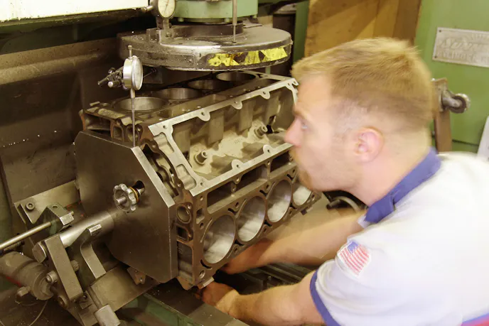 In this photo, JGM’s new owner, Ryan Peart, is using the BHJ Blok-Tru fixture to accurately position the block for machining. The fixture uses both the crank and camshaft bores to locate a crankshaft centerline. The flat portion of the fixture is used to establish an accurate deck angle and height relative to the crankshaft.