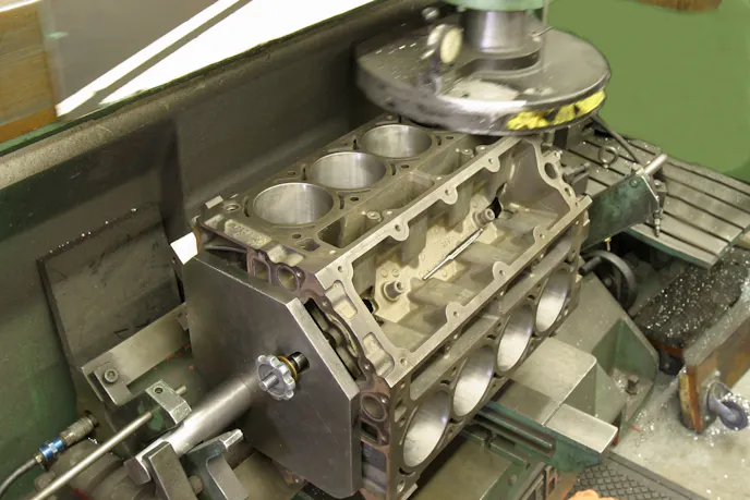 Once the block is properly positioned in the fixture and the actual heights are measured, then milling can begin. The last cut usually removes a small amount at a slower rate to create a smoother deck surface. This photo is of an iron LS block being machined.