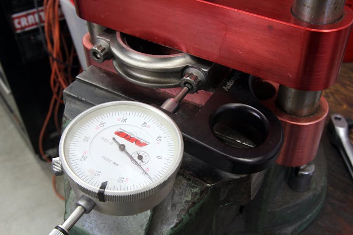 As an example, for an ARP 8720-steel, 3/8-inch small-block Chevy connecting rod bolt (P/N: 134-6003), the torque spec is 55 lb-ft using ARP’s Ultra-Torque lubricant, and that produces a rod bolt stretch figure of 0.0055 to 0.0060-inch. The only way to ensure the rod bolt has achieved this proper clamp load is to measure it with a rod bolt stretch gauge. The gauge fits over the bolt to measure its free length. Then the bolt is tightened until the stretch spec is achieved. We will look at how a variable like the kind of lubricant used can have a drastic affect on friction and therefore the amount of stretch actually imparted into the rod bolt when only a torque wrench is used.