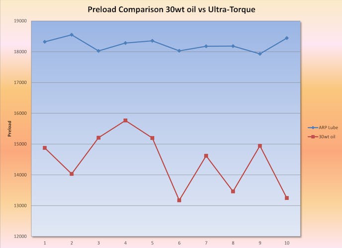 The test reveals that 30wt oil is inconsistent when torque is applied multiple times and how the UItra Torque maintained a more consistent bolt stretch after five consecutive applications. Also note that none of these applications of torque achieved the minimum spec of 0.0055-inch. We had to increase torque to 110 ft-lbs to achieve 0.0061-inch of bolt stretch.