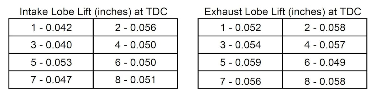 As our testing quickly revealed, none of the intake lobes were even close to being in a consistent position. Lambeck told us that he prefers to see 0.002- to 0.003-inch or less of variation to qualify a Stock or Super Stock block as acceptable. Ideally, of course, the TDC lift numbers should all agree with zero variation. But that seems unlikely with a production block.