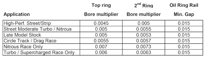 We’ve reproduced a ring end gap recommendation chart from JE Pistons that lists multiple top-ring and second-ring end gaps based on how the engine will be used. These are based on different user applications. For example, a mild street engine gap recommendation of 0.0045-inch per inch of bore would put a 4.030-inch bore small-block at a 0.018-inch top ring gap. However, if nitrous or a serious turbo boost package was in this engine’s future, the recommended gap would change to 0.006-inch per inch of bore which would produce a top ring gap of 0.024-inch – a significant increase to compensate for the higher cylinder temperature.