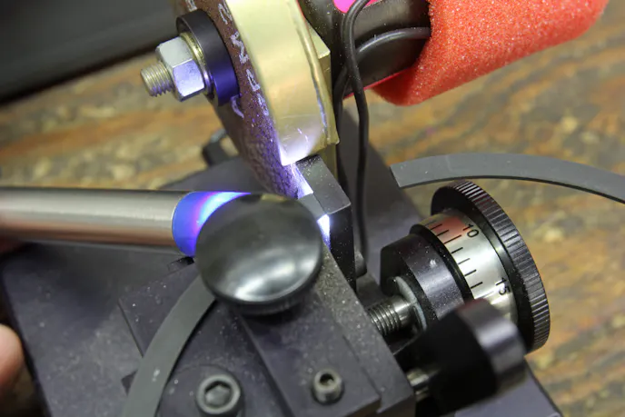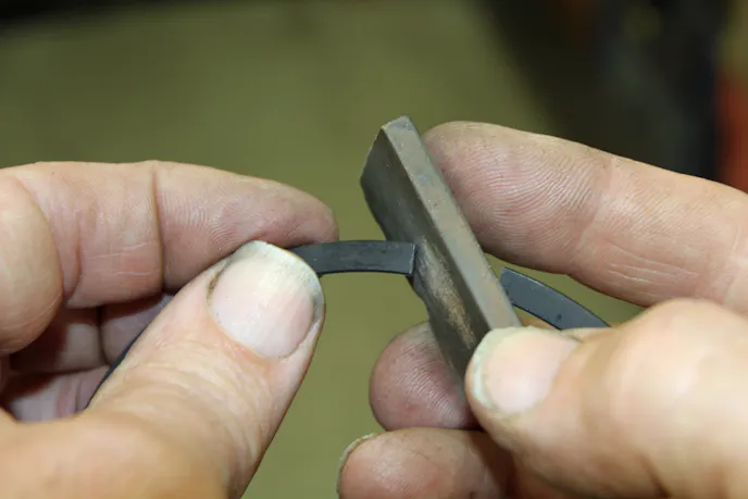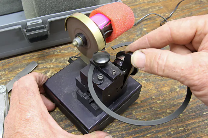 While a small flat file or even sandpaper can be used to de-burr, we prefer to use a light whetstone that is often used for sharpening knives. A couple of light passes with the stone is all that is needed.