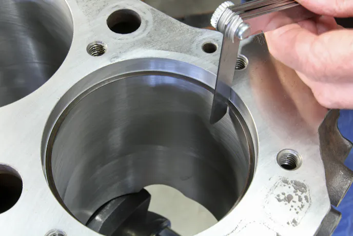 Once grinding starts, we prefer to start with a 0.003 to 0.008-inch thinner feeler gauge and work up to thicker gauge to establish the final clearance. We’ve found that this progressive change loads the ring into the bore and makes measuring the true gap more accurate.