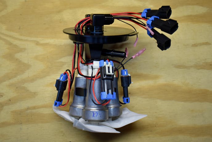 For our application, we decided on three TI Automotive F90000274 pumps, which were formerly known as the “High-Pressure Walbro 450, 465, or 485” pumps. These pumps are E85 compatible and able to operate in high-pressure applications up to 112 psi total system pressure, with a rating of 450 lph at 50 psi.