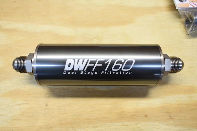 After the outlet from the pump, we also installed a DeatschWerks FF160 10-micron fuel filter. The DWFF160 uses both a 124mm-long, 304 stainless-steel mesh filter element with 65 square inches of surface area, and a neodymium magnet ring to incorporate magnetic filtration as well.
