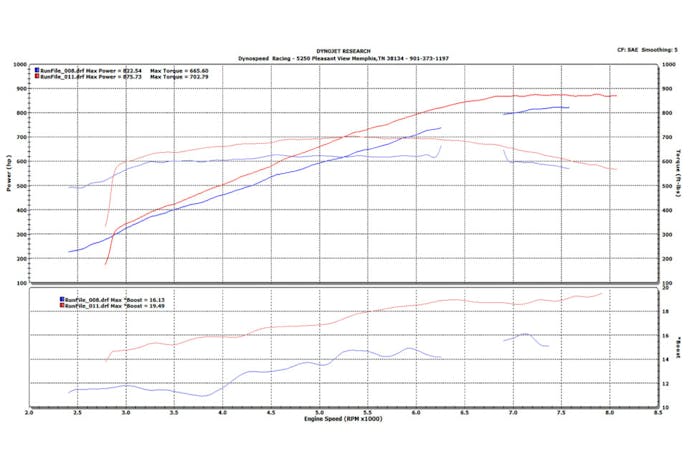 There were two more pulls made, with Lund making minor tweaks between each. The final numbers posted were 875 horsepower and 702 lb-ft of torque at the rear wheels and 19.5 psi peak boost. Not the ultimate goal, to be sure, but we reached the limit of the stock diameter crank pulley and 2.75-inch blower pulley.