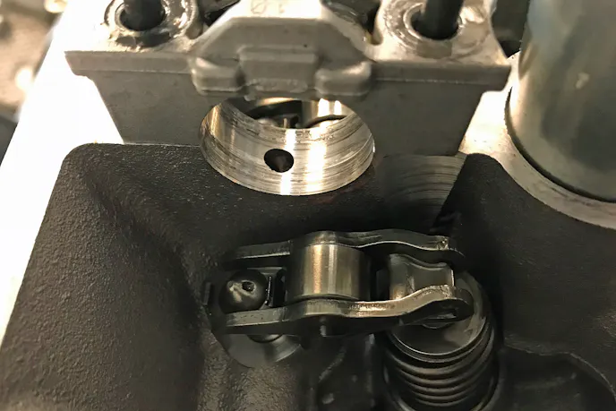 On the intake side, dual 1.500-inch Ferrea stainless valves were spec’d, while on the exhaust, Ferrea’s Super Alloy material was chosen, with a 1.262-inch valve diameter. Both intake and exhaust valves use the triple locking groove and the factory valve stem diameter.