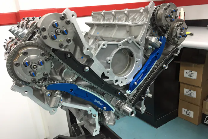 Wrapping up the valvetrain – no pun intended – are a set of new Ford Performance Parts primary and secondary timing chains and VCT cam phasers (P/N: M-6004-A5015) coupled with a set of Powerstorm billet timing chain guides (P/N: LPP823129). Livernois designed these pivoting guides for the Coyote to be exceptionally strong and replace the OEM cast guides. In addition to strength the billet design offers an increase in rigidity, which is a key factor in high-RPM valvetrain performance.