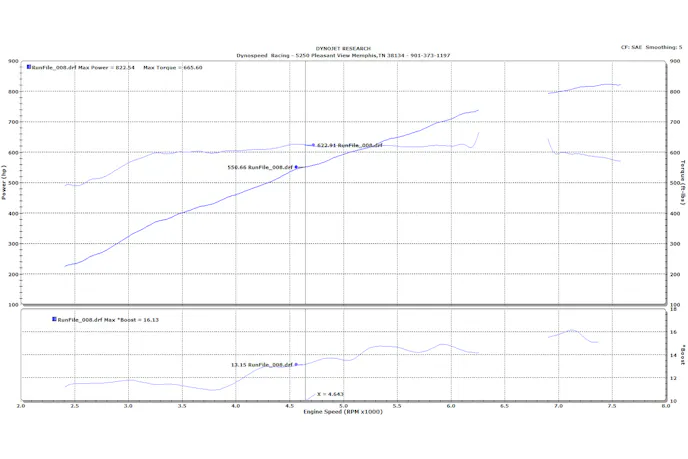 Unfortunately, our session ended with only 822 horsepower at 7,400 rpm, and a weird torque hiccup at 6,300 rpm. Taking that out of the equation, peak torque appears to be about 630 lb-ft at 4,600 rpm. With peak boost numbers right at 16 psi, there is definitely more room in the supercharger.