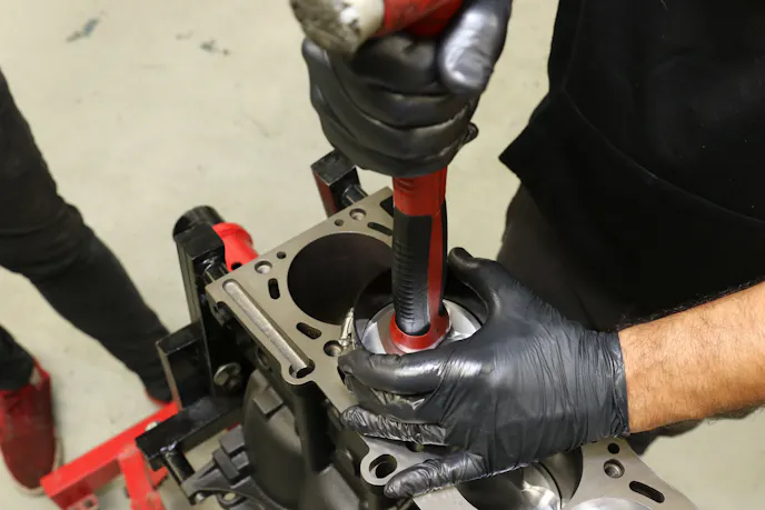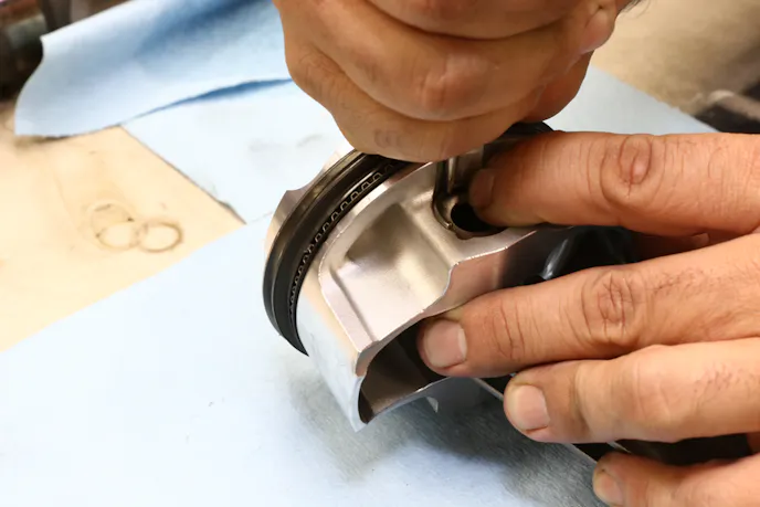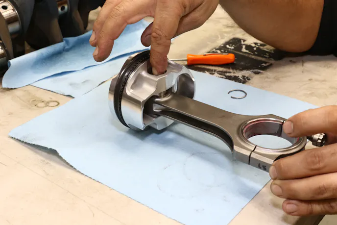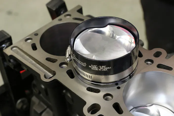 Essa installs the JE rings onto the JE stock compression ratio asymmetrical pistons. He conjoins the Carrillo rods and installs the pin and clips. Finally, a ring compressor allows the assembly to slide down into the bore.