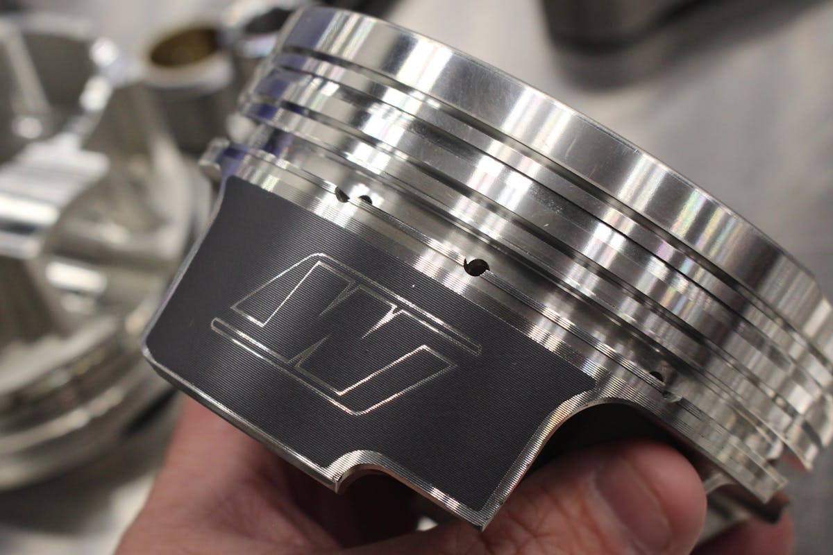 Hanging off of those rods are a set of Wiseco 4.220-inch forged 2618 pistons built for boost. The 2618 alloy is designed to be stronger under increased combustion pressure, while the 22.0cc inverted dome design keeps the stock compression with the worked-over cylinder heads. The skirts are coated to reduce friction and the pistons come with a heavy-wall .990 wrist pin from Trend Performance. The pistons also come with a .043-inch/.043-inch/3.0mm ring package, as well as oil support rails, since the wrist pin intersects the oil ring land.