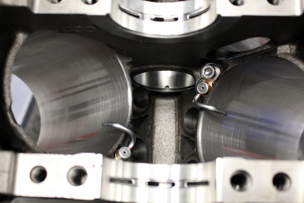 Wiseco's box strut design necessitated a slight bending of the OEM oil squirters to clear the pistons at the bottom of their stroke. That was easily accomplished with gentle pressure from a pry bar.