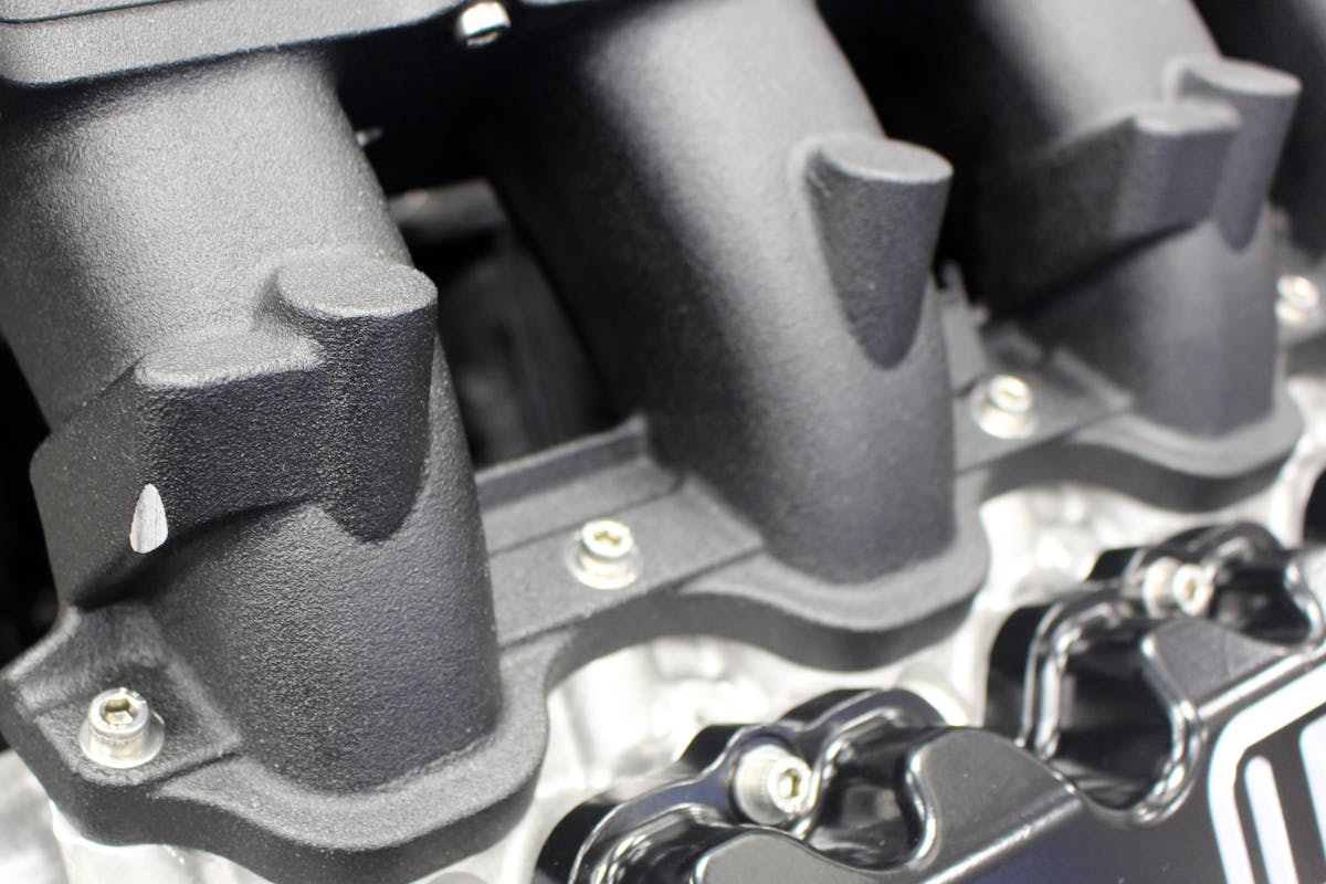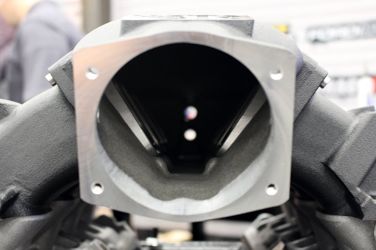 There’s no denying that one of the most recognizable features of the Godzilla engine is the “unique” intake manifold design, which was built to clear the obstacles inside of an F-250 engine bay. Getting rid of that OEM manifold, we opted for one of Brian Tooley Racing’s new Trinity manifolds for the Godzilla. Trinity refers to the three-piece design, which allows the runners to be removed from the plenum. This makes porting easy, and also allows for different runner designs to be utilized with a common plenum.
