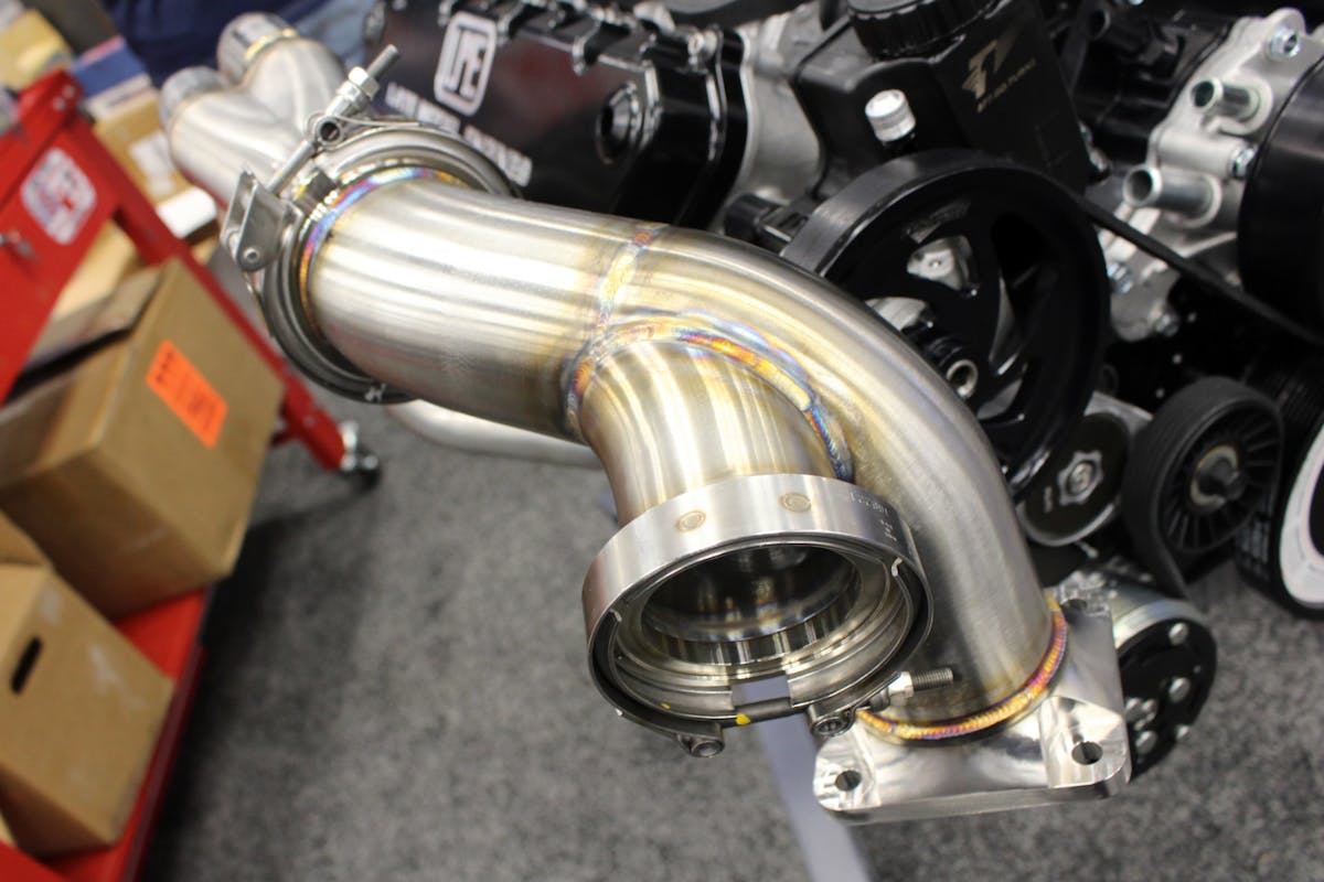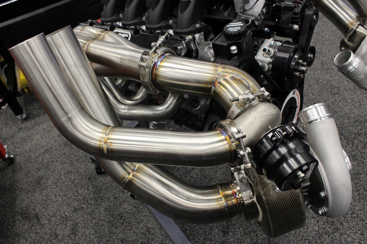 The final piece of the giveaway engine puzzle came together on the final day of the PRI Show, and that was the turbo system. We started with a pair of Kooks upwards-swept forward-facing stainless turbo manifolds. Designed to fit the Godzilla engine into a Fox body, the all stainless-steel 1-3/4-inch primaries help get spent gases out of the engine and to the hot side of the turbocharger as efficiently as possible.