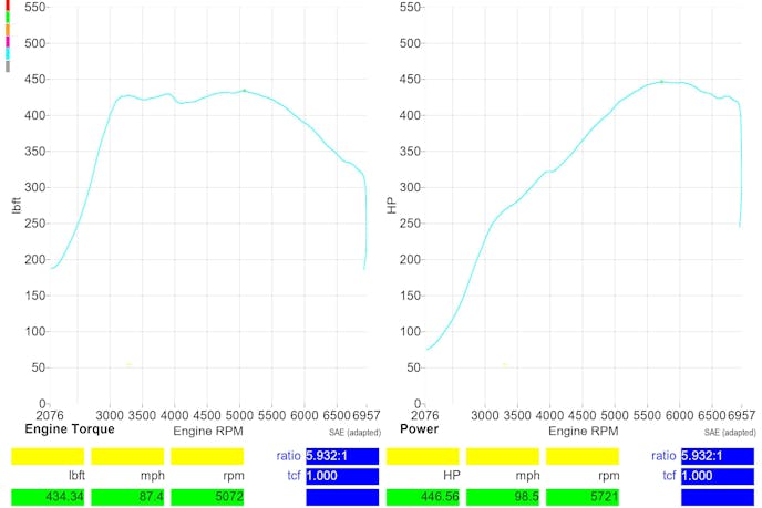 After a dyno session at Drive Autosports, the results were encouraging. Though power was never the aim with this setup, some of those mods aimed at reliability snuck a few extra horsepower in through the back door. The result with 20 psi and a tank full of E85: 444 horsepower and 423 lb-ft of torque. There’s another benefit to this torquey, responsive engine; almost all the torque is generated by 3,000 rpm.
