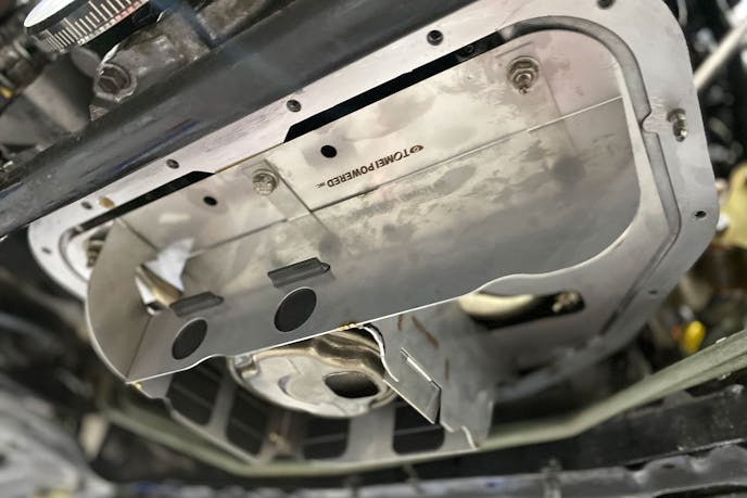 While the folks running JZ engines at the pro level run a dry-sump oiling system, this was simply out of the budget. A simple “halfway” solution was the addition of this baffle, complete with all the trap doors needed to keep the oil from sloshing away from the pickup points as the engine buzzes about at 7,000 rpm.