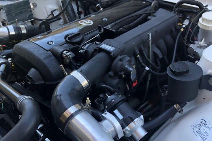 Interestingly, Mayer first swapped a Toyota 1UZ into this car. For his first year in the Northwest Grassroots Championship, that 4.0-liter V8 was just fine. However, a year in, he felt the urge to step up to the Pro-Am series, which would require doubling the power in order to stay competitive. Plus, the V8 wasn’t destined for great things. “The 1UZ was connected with two crusty harnesses, so I didn’t have much faith in the engine lasting — especially if I turbocharged it. I considered an LS1, but getting one into competitive shape would’ve cost more than modifying a 1JZ would. But above all this, I just love the sound of the 1JZ. I started with stance cars, so style means a lot to me,” he admits.