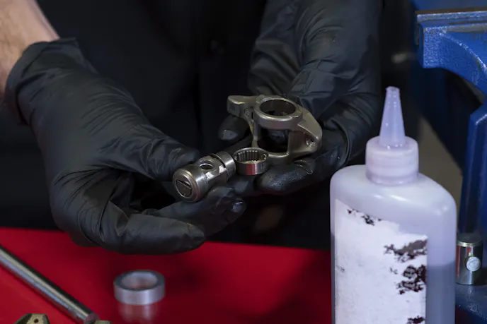 Important: Make sure the trunnion shaft rotates freely inside the rocker arm. If it does not, you will need to press the bushings back out and either try again or consider replacing the rocker arm itself, as it may be bent. We cannot stress how important it is to make sure that the trunnion shaft spins freely.