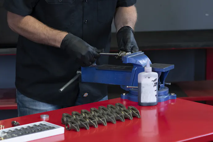 Open the jaw of your vice out approximately 5-6 inches. Take the largest of the three dies in your Engine Pro kit and place one side of the rocker (bearing) against it. Make sure to have the bearing aligned in the center of the die cup, to insure you are not pressing the bearing against the die itself. Align the long pin from the tool kit to the center of the opposing trunnion shaft end. Begin closing the vice, and watch for binding as the shaft and bearing begin to press into the die cup. At this point, the trunnion shaft should be free. The opposing bearing can be removed from the center of the rocker arm once the trunnion shaft is removed.