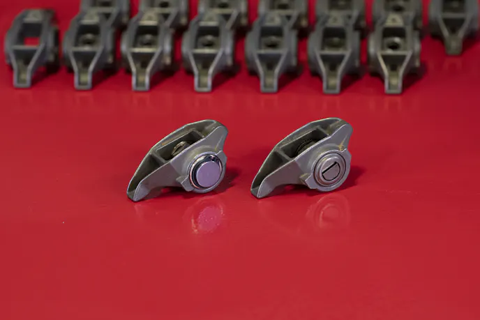 GM’s trunnion rocker assembly design in Gen III (LS1) engines and their offset counterpart used in Gen IV (LS3) engines share a ductile iron 1.7:1 rocker arm, with a flat tip, which makes contact with its respective valve stem. The arm has two sets of needle bearings — one on each side — which are pressed into the body of the arm itself. Between the bearings is a trunnion shaft, which ultimately holds the rocker assembly in place, and serves as the fulcrum.