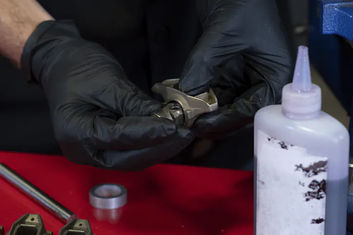 Remove any loose needle bearings that are left over, and be sure to thoroughly clean the rocker arm with a solvent such as brake parts cleaner. Using one of the smaller two dies, press one of the new bushings into the rocker arm until it is flush. Do not use excessive force; it could result in damage to the rocker arm. Lubricate the inside bearing surface with assembly lube and align the trunnion shaft into the center. Lubricate the other bearing surface of the trunnion shaft. Using one of the matching dies on each side, press the second bushing into the rocker arm until it is flush.