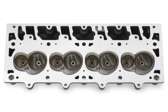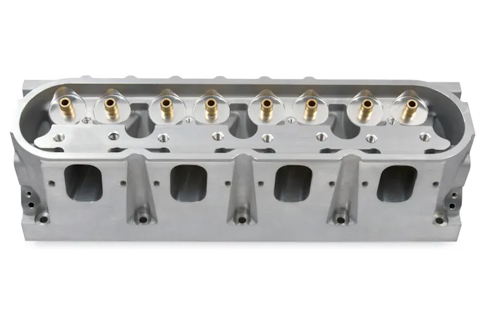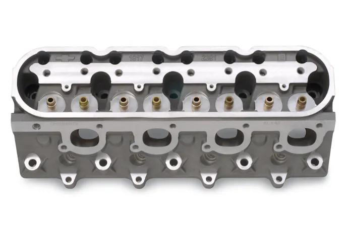 1.8:1 ratio LS7 rocker arms with roller-bearing trunnions translate the pushrod’s motion to the valve. PSI Spring Max Life beehive valvesprings of an undisclosed rate keep the valves under control, while Chevrolet Performance lightweight steel retainers and locks keep everything together.