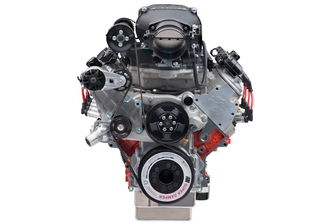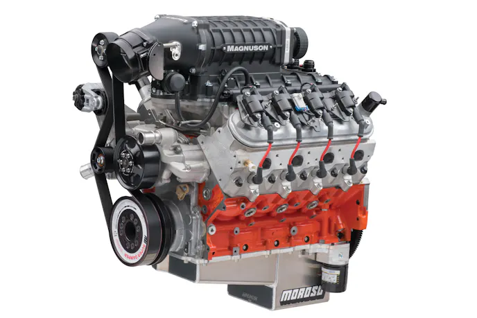 A Moroso fabricated aluminum oil pan holds seven quarts of oil to keep the wet-sump oiling system fed, while an SFI-approved 10-rib ATI Super Damper keeps all the engine’s harmonics in check. Unlike the other COPO engines in the lineup, the supercharged 350 shuns an electric water pump, with engineers instead opting for a modified LS3 mechanical pump.