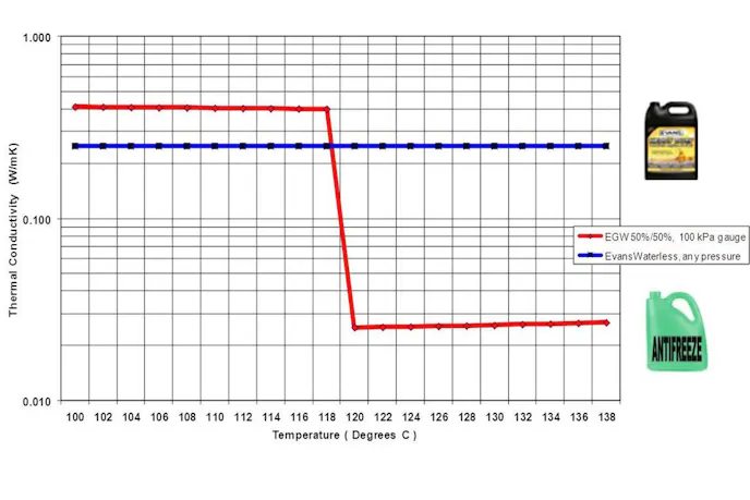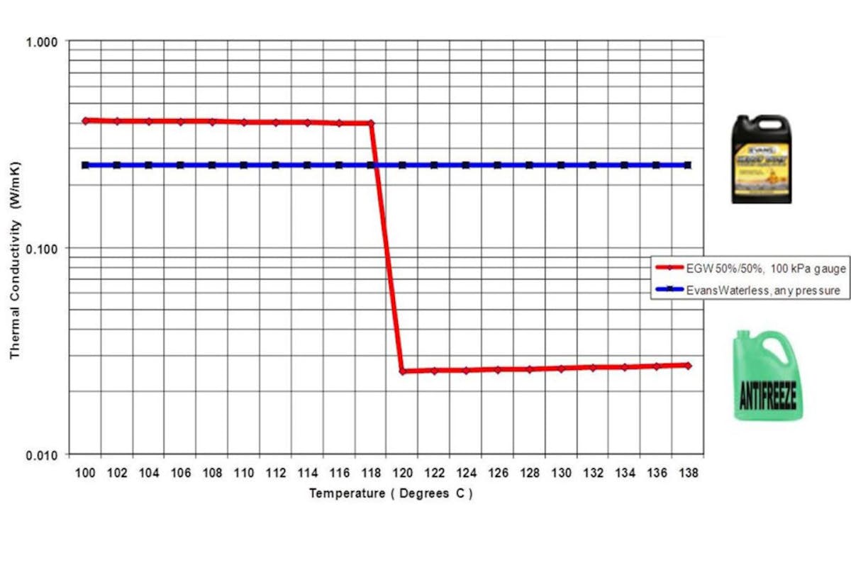 Tourville describes this type of condition for water based coolants as “going over the vapor cliff.” He explains, “This is where customers of Evans Waterless Coolant really benefit. When steam occurs, you’ll see heat transfer reduced to about four-percent of the effectiveness of water. But Evans boiling point far exceeds water/coolant mixture specifications, despite what pressure radiator cap you choose. So you should expect to see far superior protection from Evans, that’s what you’re really paying for.”