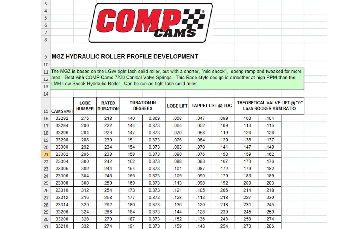 The full range of new LST lobes are not in the current printed COMP Cams catalog but can be found on COMP’s website. The hydraulic-roller families are the MGZ, MGH, MBZ, MBX, MGJ, MGD, MGR, LPM, LSD, XLD, XLP, XIX, and LSO lobes. Here, we’ve copied a section of the MBZ lobe listing. Note that this lobe family offers a tremendously wide range of duration and lift specs. The full MBZ listing spans all the way to 274 degrees of duration at 0.050 (332 degrees at 0.006-inch tappet lift). These lobes are compatible even with rocker ratios of 1.8:1 so there is a wide spread of opportunities. These master lobes can also be applied to a broad variety of engines including small- and big-block Chevys and many others.