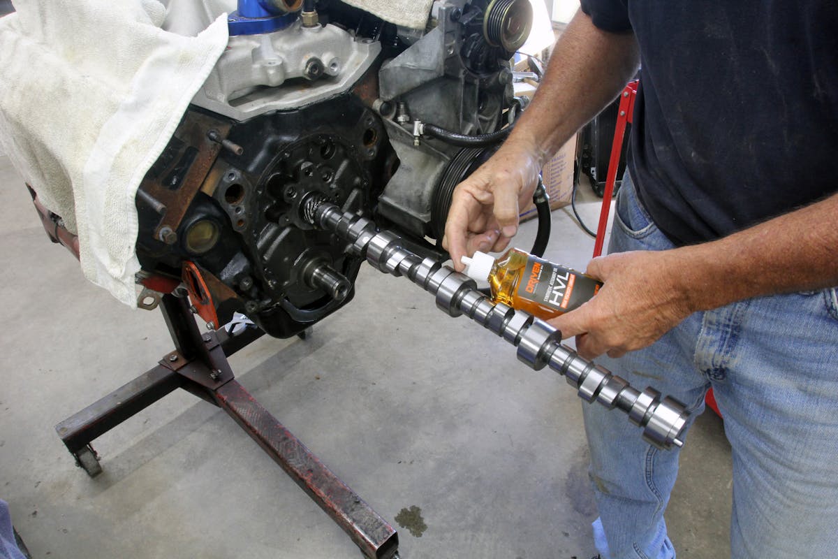 We installed the new cam after placing Driven assembly lube on the distributor drive gear and all the lobes and journals (left). Production small-block Chevys starting in 1986 changed to a one-piece rear main seal and were machined to accept a factory-style hydraulic roller cam with a stepped nose and this limiter plate.