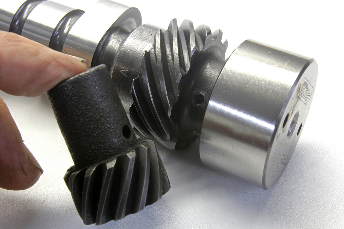 We yanked the new HEI distributor, but the gear looked fine. This demanded pulling the engine from the car. After removing the cam, the distributor drive gear was found to be badly damaged and was clearly the cause of the problem. However, the cause of the gear failure was still unclear.