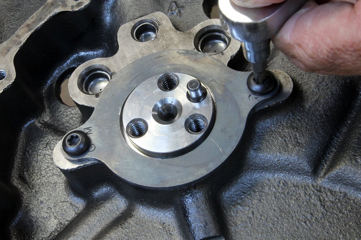 Once the new cam bearings were in place, and after we thoroughly washed the engine with hot soapy detergent and then flushed it clean, we reassembled the engine. This time we used a factory cam limiter plate, as this crate engine was based on the one-piece rear main seal style small-block that will accommodate a stepped nose hydraulic roller camshaft.