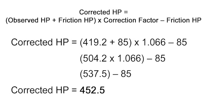 Most dyno sheets will indicate the percentage of correction factor applied to the observed numbers. In our example dyno test, the STP correction factor came to 1.066 which will add 6.6 percent to the observed numbers. However, corrected horsepower is not quite as simple as multiplying the observed numbers by the correction factor.