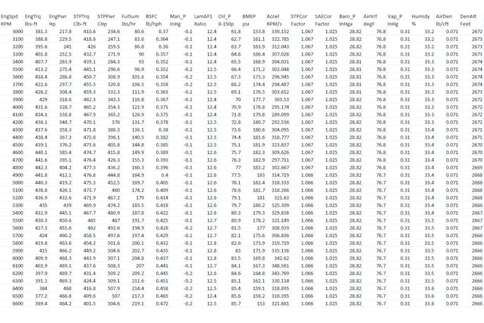 The full SuperFlow report lists a total of 91 separate channels of information either as inputs, test results, or calculated values like BMEP. The ones listed here are only a few of the more often used. The first two columns are observed power, followed by STP corrected power numbers.