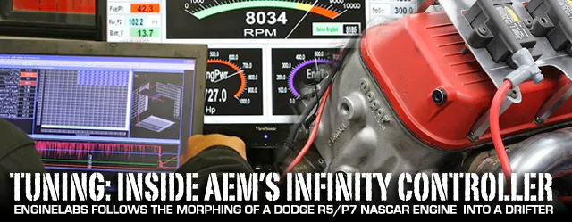 With help from AEM Electronics, a Dodge 356ci V8 originally built in 2006 to run in the Busch Series (now Nationwide) has been upgraded with EFI and prepped for drift competition across the Pacific. EngineLabs was on hand as the engine fired up for the first time with AEM’s new Infinity engine-management controls in place.