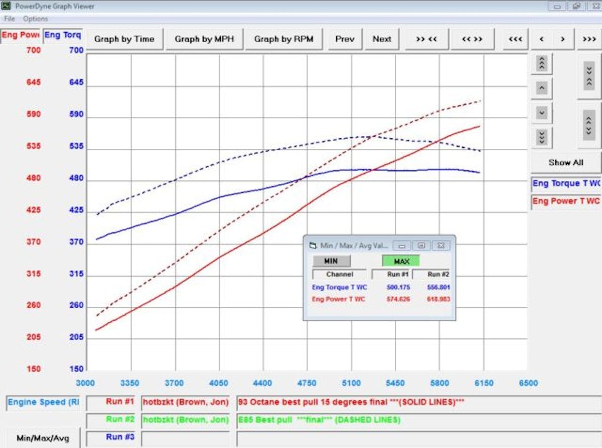 Pump E85 was a killer fuel after tuning, as it made a solid 618 rear-wheel horsepower on our Mustang Dynamometer, soundly defeating our baseline fuel of pump 93 octane gasoline at 574 rear-wheel horsepower. It also beat 93 octane plus meth injection (we’ll call that 93+MI) by 2 horsepower—and as you know I’m going to point out, that’s in the margin of error; which means it’s not enough to call a true winner.