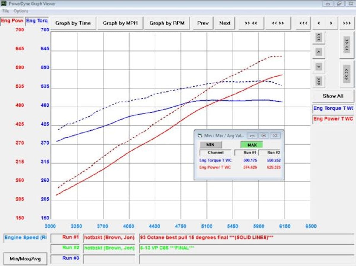 As we hoped, the race fuel came through and made a show of its strengths. Check out the results below. 93+MI results are the solid lines, and dashes are VP Racing’s C85.