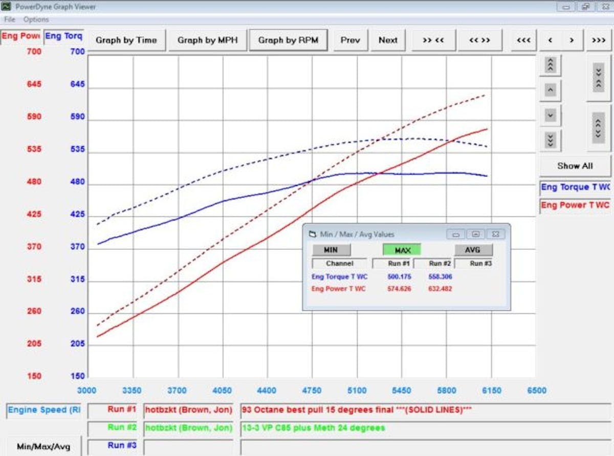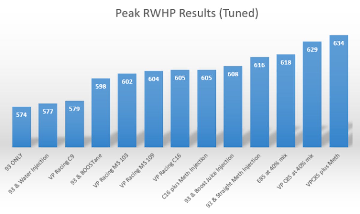 - VP Racing C85 plus meth injection (40-percent for consistent testing and fuel system limitations)
